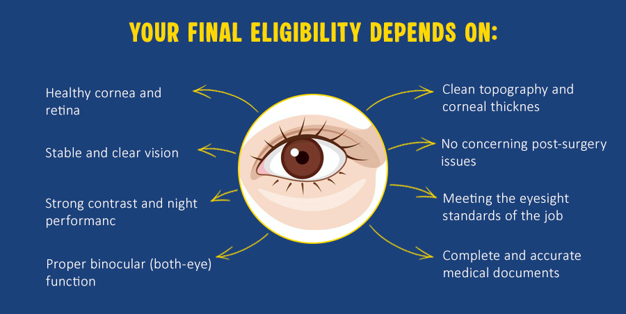 Not always, no single procedure guarantees eligibility. Different jobs evaluate the eye’s final condition, not just the surgery type. Your surgeon must decide the safest option for your eyes.
