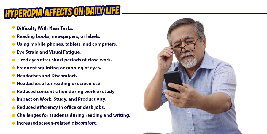 Hyperopia affects daily life by making near tasks tiring and uncomfortable. The eyes work harder to focus, so you may feel strain even during simple activities.