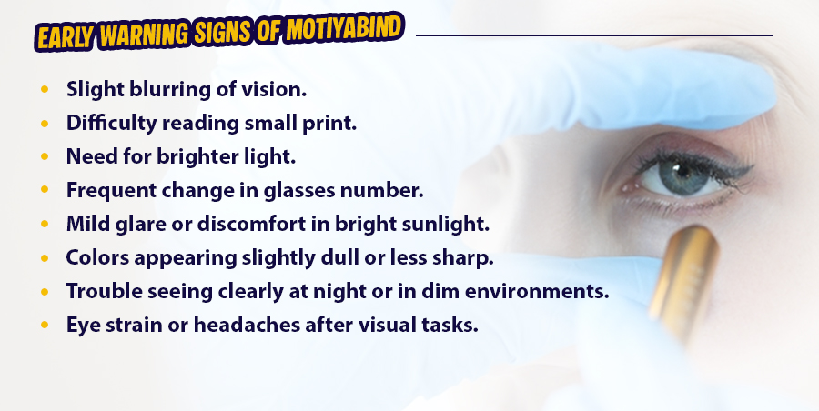 Early Motiyabind Symptoms include slight blurring, glare in sunlight, needing brighter light to read, and frequent change in glasses power.